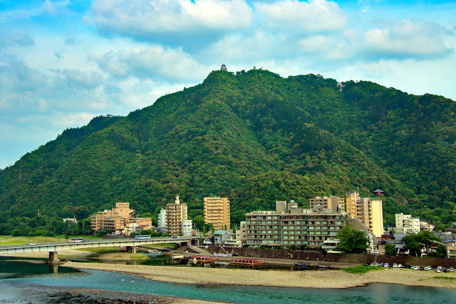 金華山と岐阜城、長良川の鵜飼い見物乗り場周辺 |
