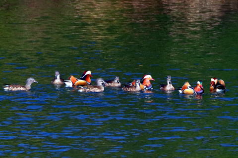 ![]() オシドリ1:並んで、並んで。少し混み合ってきたかな? |